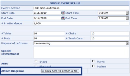 | Yes. On the Event Set-up portion of the form, there is an "Attach Diagram" section that allows you to upload a file that will help our Custodial Services Division in planning for the Setup. The file can be an image (.jpg, .bmp, etc.), a Word document, an Adobe PDF file, or any other popular file type.