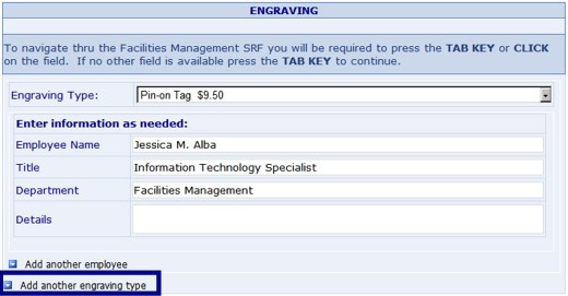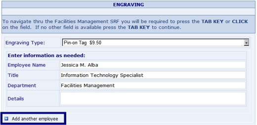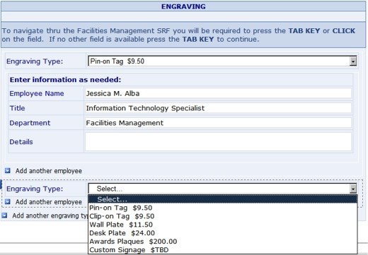 | Yes. After providing the information for the first employee, click on the "Add another engraving type" link and the "Engraving Type:" menu will appear. Once you have made a selection, a new set of employee information fields will appear.