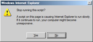 | This is a confirmed issue that occurs when the requestor selects a Room number from the list of rooms that belong either to the Dental School or Medical School building. The error seems to occur only when the Microsoft Internet Explorer browser is being used. The cause of this error is due to the number of rooms belonging to both buildings. As the requestor selects the building from the dropdown list, the browser queries the list of rooms for that building. Given the number of rooms for each building, the query or script "times out", resulting in the error. To get rid of the error, click on the 'No' button so you may proceed with the rest of the form.